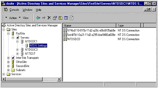 La console ci-dessus est positionnée sous l'ordinateur NTDSDC1. Trois connexions sont affichées. Si elles ont été établies par le service KCC, leurs noms sont des GUID (identificateurs globaux uniques).