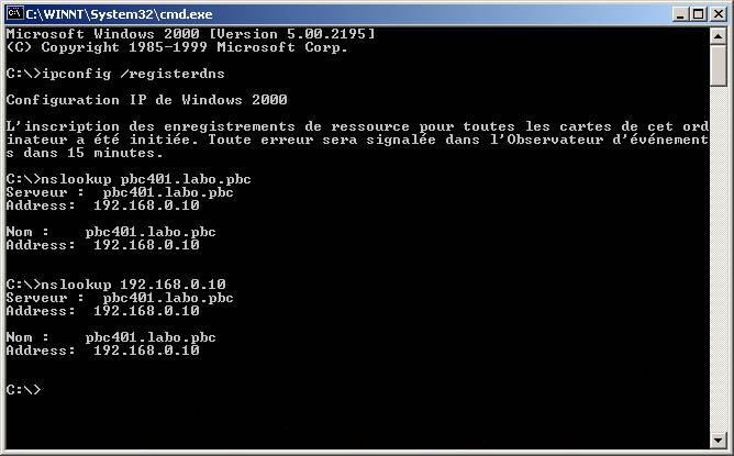 nslookup pbc401.labo.pbc doit retourner l'adresse IP