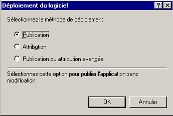 Uniquemment disponible au niveau de la stratégie de l'utilisateur, la publication met à disposition l'application au niveau de l'utilisateur, elle appparaît dans ajout suppression de progrrammes, l'utilisateurvest libre de l'installer ou pas