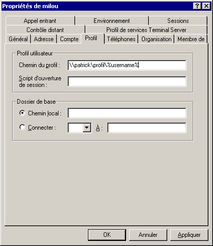 Dans les propriétés de l’utilisateur il faut indiquer le chemin UNC