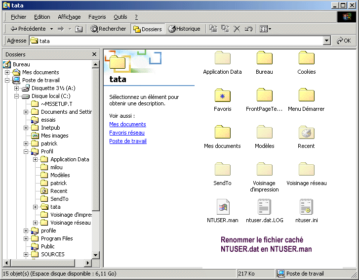 Attention dans le répertoire de l’utilisateur le fichier ntuser.dat est caché