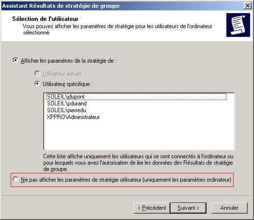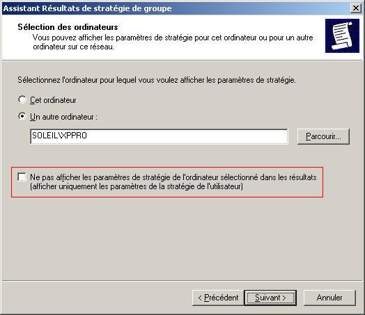 Nous avons ensuite la possibilité d'analyser l'ordinateur local ou une station distante. On peut aussi n'afficher que les stratégies touchant les ordinateurs et non les utilisateurs en cochant la case appropriée. Cela accélère le processus